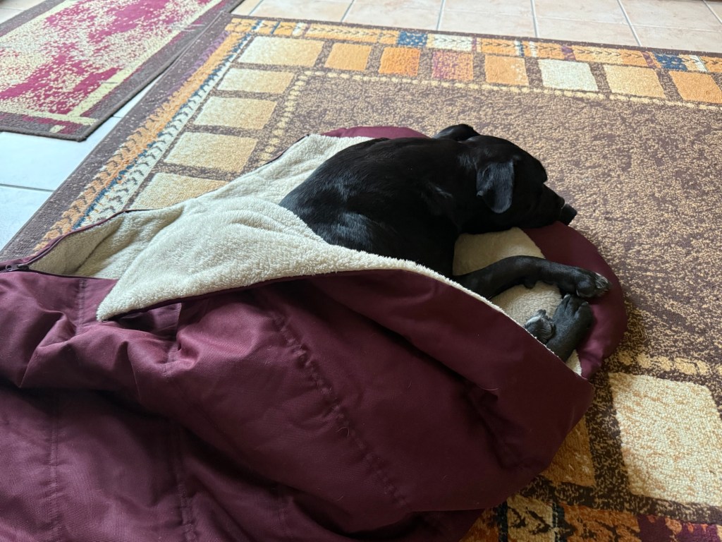 Das Bett ist gebaut, das Telefon geladen, das Zelt zum Trocknen aufgehängt und der Hund schnarcht schon seelig neben mir auf dem Boden und dünstet den unterwegs gefressenen Maiskolben Achtern wieder aus 🤢