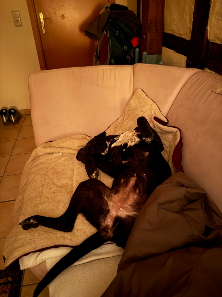 Der Rest der Nacht verläuft ohne weitere Schritte oder Geisterbesuch. Nun schläft es sich aber mit Licht schlecht, genauso war die Nacht. Sehr unruhig, alle Nase lang wach, hätte ich doch lieber im Zelt schlafen sollen irgendwo??? Neeeeeeeee, hier ist’s warm und trocken. Mir dröhnt der Kopf. Na super. Wandern mit Kopfschmerzen ist bestimmt prickelnd 🤯 Thomapyrin wird’s hoffentlich richten, zum Glück hab ich genug dabei. Hund muss 5.30 Uhr raus und denkt es gibt gleich Frühstück. Am Arsch. Ich krabbel nochmal zurück in meinen Schlafsack, stelle den Wecker aus und schlafe wieder ein.