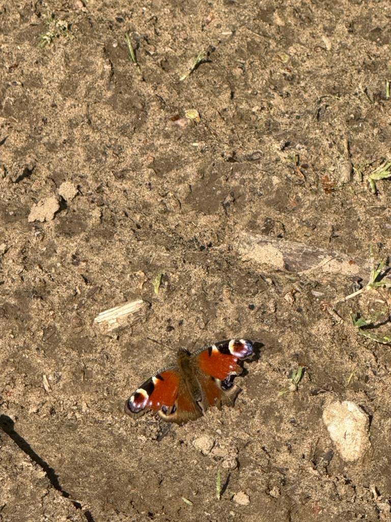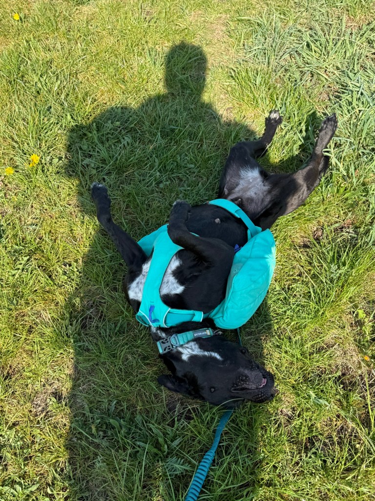Schuhe und Socken ausziehen… Göttlich… Ein Stoßgebet des Dankes an meine Kollegin geschickt, die mir den Tip mit Barfussschuhen gab. Heute liebe ich sie. Die Schuhe natürlich 👟 Hund rollt im Gras herum und freut sich des Lebens. Rucksack runter… Aaaaaaah… Was für eine Wohltat.
