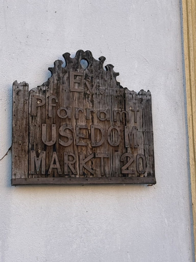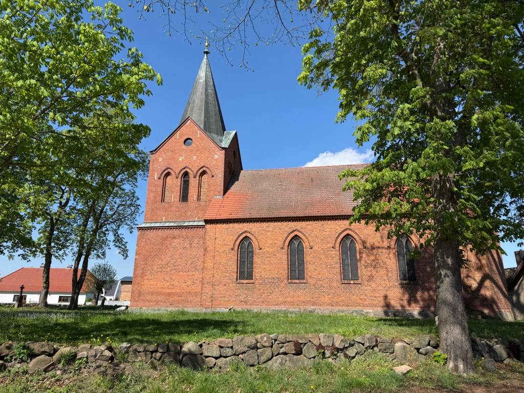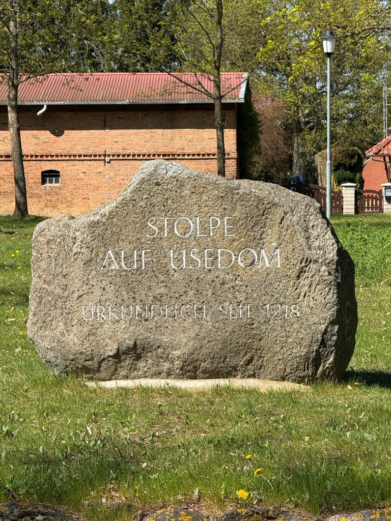 Nächster Halt sollte Stolpe sein. Die Strecke zog sich und kurz vor dem Ziel, der Dorfkirche, meldeten sich dann auch meine Schulter und die Füße das erste Mal. Endlich angekommen um 12.30 Uhr haben wir im Schatten der Kirche eine längere Pause eingelegt, etwas gegessen und getrunken. Zum Glück lagen damit schonmal 3/4 des Weges hinter uns. Noch eben den Pastor in Usedom angerufen und unsere ungefähre Ankunft angekündigt. Keiner da 😱 Zum Glück rief er relativ zeitnah zurück, er wäre aber erst frühestens um 16 Uhr in Usedom, weil er noch Gottesdienste hat. Macht ja nix, wir warten gern, Hauptsache wir bekommen ein Bett und müssen nicht noch weiter rennen.