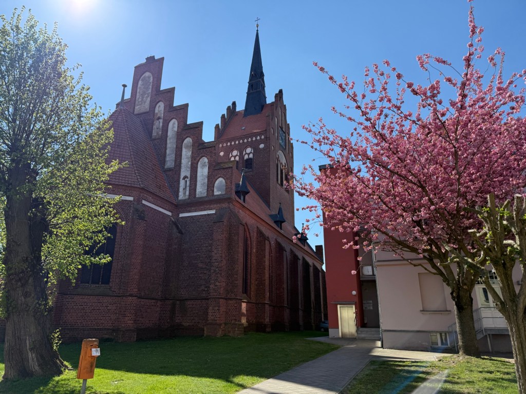 Wie gesagt, die letzten Kilometer zogen sich wie Kaugummi. Yuna kühlte ihre Pfoten zwischendurch im feuchten Gras, was bei mir bestimmt etwas eigenartig ausgesehen hätte, wenn ich da so rumgerollt wäre am Straßenrand 🤣Dann kam endlich der Usedomer Kirchturm in Sicht. Jippieh 😍 noch 3x um den Pudding gelatscht und pünktlich um 15 Uhr standen wir vor der St. Marien Kirche 💒