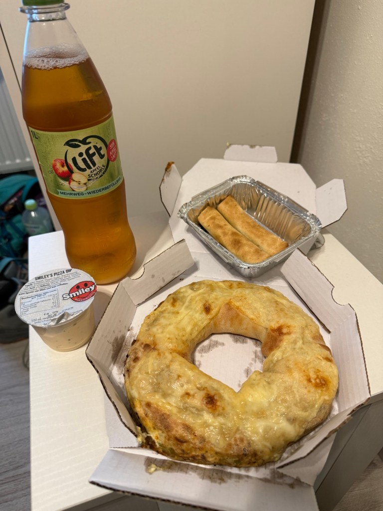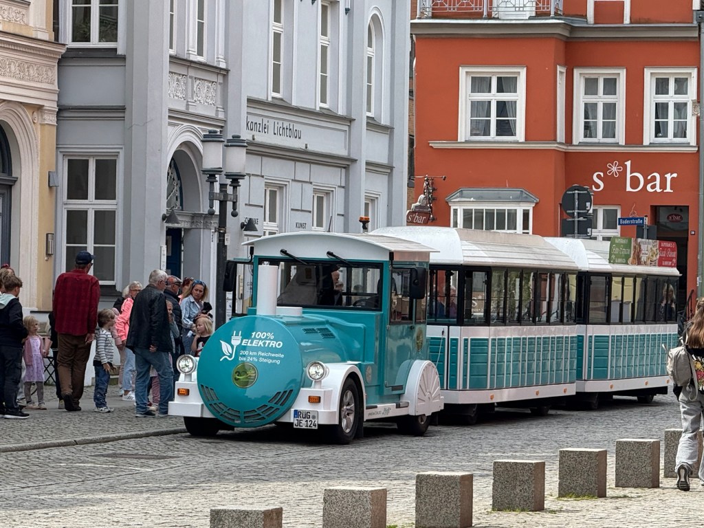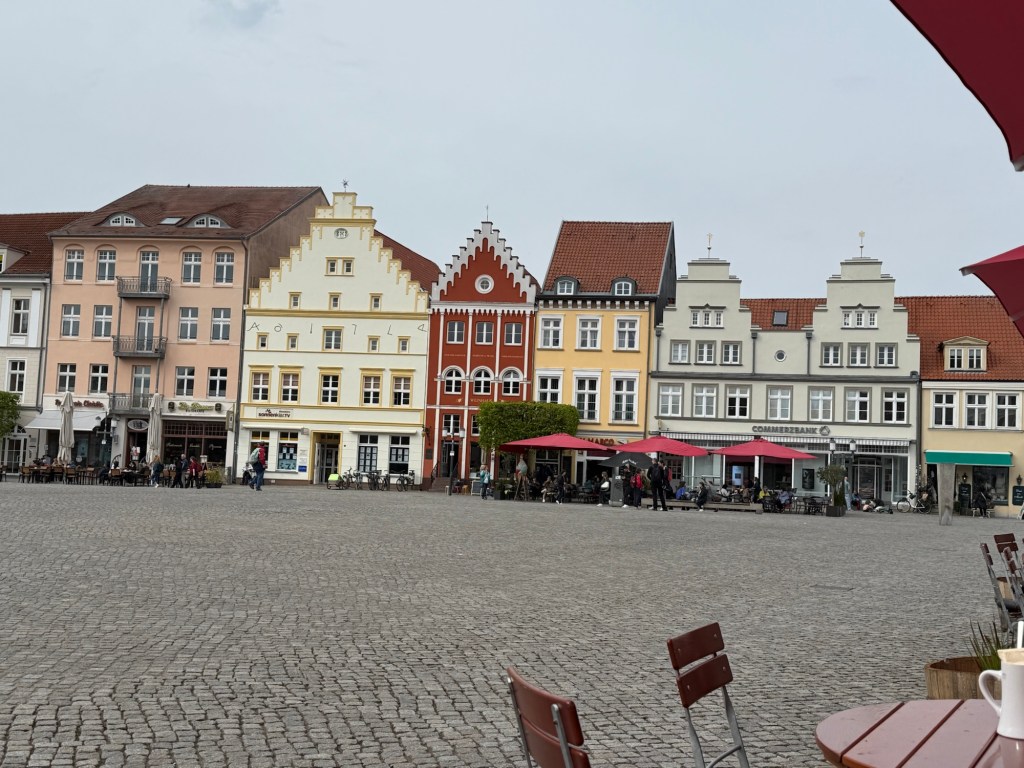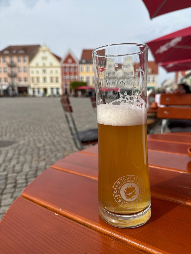Am Marktplatz schiesst mir „Radler“ durch den Kopf. Ich wollte doch unbedingt ein kühles großes Radler. Also setzen wir uns erstmal in ein Café. Bestellung aufgegeben. Tja gerne, sagt die Bedienung und strahlt mich an. Wir hätten Radler mit Banane, Zitrone, Rhabarber, noch irgendwas und Sanddorn… 🤯 What??? Schonwieder Entscheidungen treffen… Bin im Norden, also Sanddorn. Mega lecker rinnt das köstliche kühle Naß meine durstige Kehle hinab. Dazu gibt’s nen kleinen Salat mit Scampis 😍 Göttlich. Aber klein halt. Heute Abend werde ich dekadent bei Smileys bestellen und fressen bis ich platze 💥
