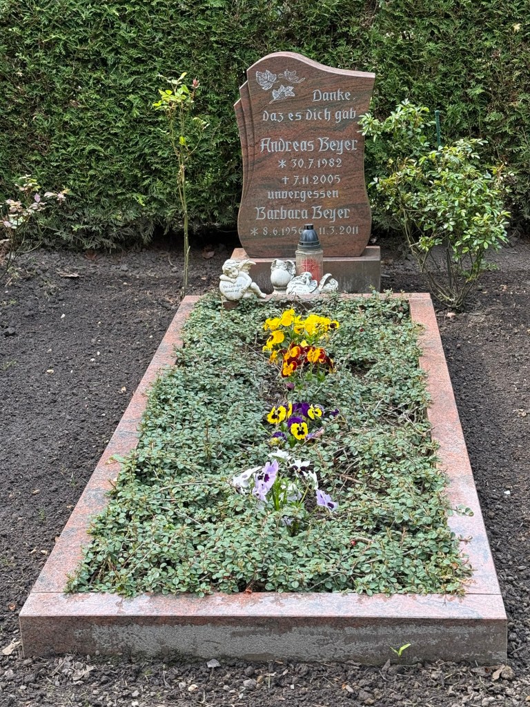 Es ist kurz nach 1… Also quer durch die Stadt, am Bahnhof vorbei und stadtauswärts Richtung Friedhof. Vieles hat sich gar nicht verändert, anderes sieht total verändert aus. Der Friedhofsbesuch war neben den Pilgerstempeln eines meiner ToDos in Greifswald. Ich war knapp 10 Jahre nicht mehr am Grab meiner Mutter und meines Bruders. Nehme erstmal den Haupteingang und suche mir nen Wolf. Keine Chance. Also da rein wo ich mich auskenne (hört sich auch irgendwie merkwürdig an sich auf einem Friedhof auszukennen 🤔). Rechts, links und schon da. Ein paar Tränchen verdrückt, was man halt so macht aufm Friedhof, freue mich, dass sich doch offensichtlich noch jemand darum kümmert, dass das Grab schön aussieht, und wieder zurück Richtung Stadt.