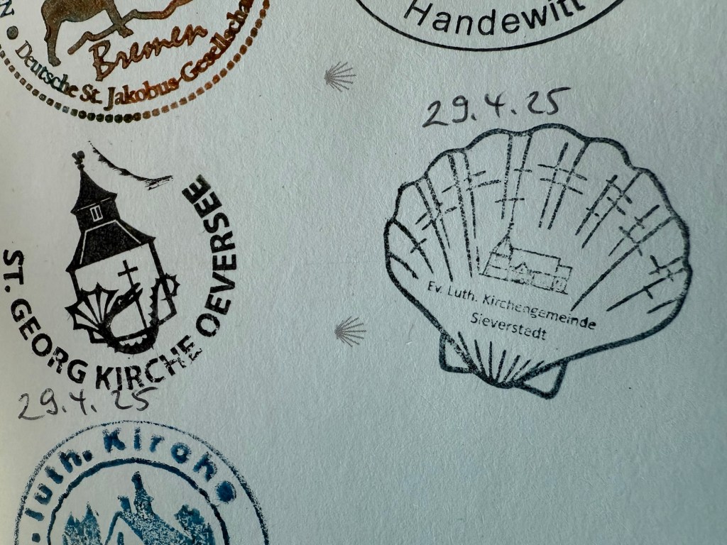 Nachdem wir ja gestern zu spät waren, haben wir heute früh dann erstmal unsere Stempel in der Oeverseer St. Georg Kirche abgeholt. Alles offen, alles zugänglich, wie gestern Abend von dem netten Herrn auf dem Friedhof versprochen. Läuft bei uns 👌🏻 Leider habe ich beim Rausholen aus der Tasche Yunas Pilgerausweis zerrissen. Zum Glück nur an der Falzkante. Vielleicht kann ich den zuhause mit Tesa wieder flicken… 🤔