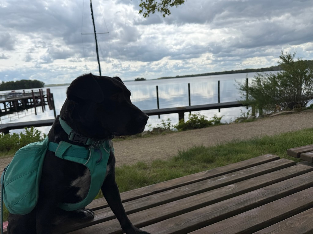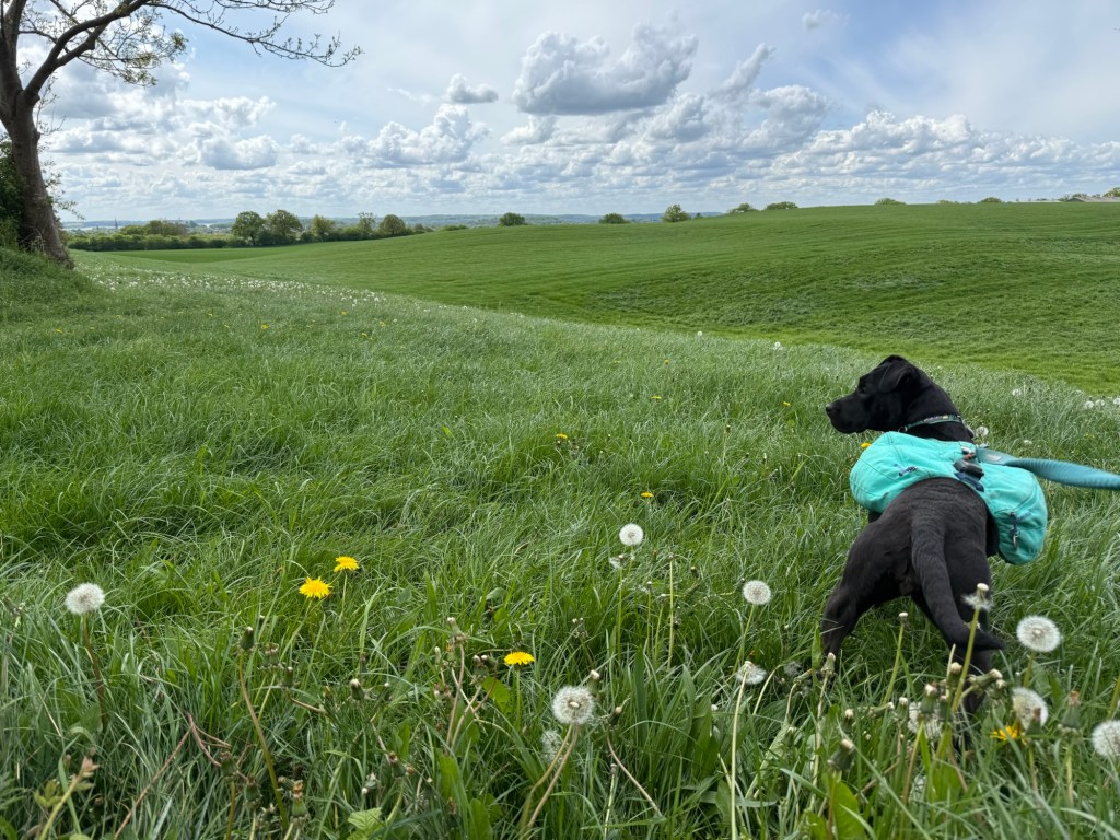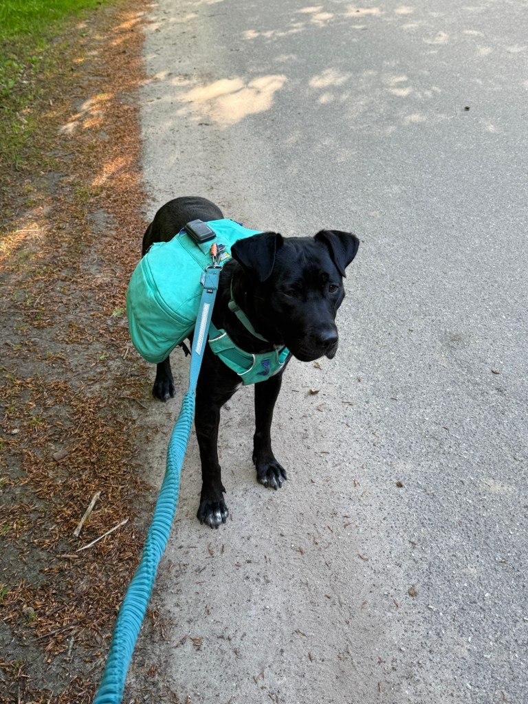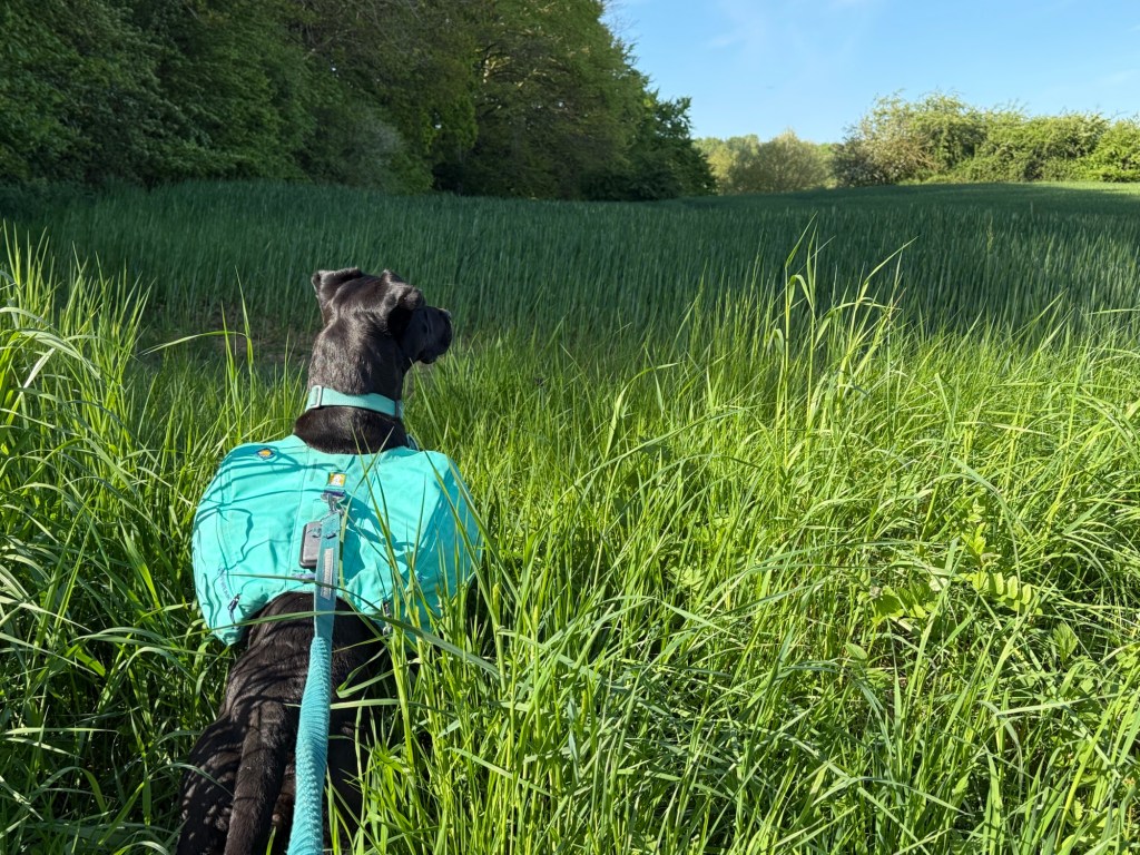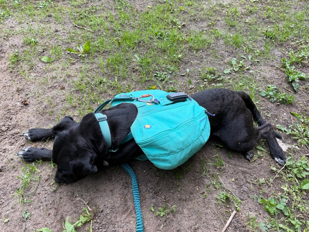 Yunas Rucksack ist heute 320 g schwerer als gestern, aber bisher (bis auf einen kurzen auflodernden Streik der Hundewanderergewerkschaft HuWaDi, der mit Leckerli niedergeschlagen werden konnte) macht sie super mit. 6 von 18 km haben wir schon geschafft. Da darf das erste Brot 🍞 samt Apfel 🍎 schonmal den Weg in die Futterluke finden.