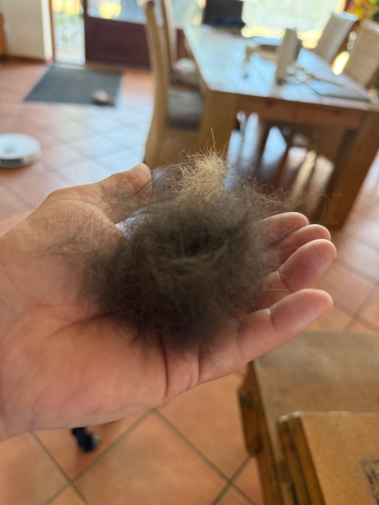 Das Hundetier ist derzeit in der Mauser zum Sommerfell. Überall liegen Fellflocken rum… Das wird bestimmt meeeeega im Zelt. Meine Freundin Nadja meinte, ich könne mir ja daraus eine wollige Matratze machen. Wo sie recht hat ☝🏻 Es liegt sich ja auch viel besser bei angesagten 4 Grad Nachttemperatur auf einer wärmenden Matte aus Hundefell. Vielleicht sollte ich da noch direkt was von zuhause mitnehmen. Wiegt ja nix und ich habe gerade 3 Bürsten ausgekämmt aus den Klapperköppen. Darauf die Isomatte und man schläft wie zuhause im Boxspringbett 🛌