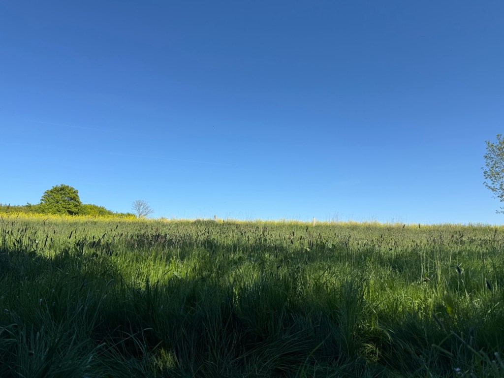 Nachdem wir aus Hutzfeld raus waren, habe ich dem heiligen Jakobus, dem Schutzpatron der Pilger, eine Anfrage geschickt für einen schönen Schlafplatz, wo wir ungestört nächtigen können und nicht von Wildtieren oder unzufriedenen Menschen gestört werden. Dieser Bitte kam er auch fast umgehend nach. Also flugs das Zelt aufgebaut und jetzt stehen wir im Schatten, der Wind säuselt über uns hinweg und wir gucken auf ein Rapsfeld. Ist das schön hier. Und das 1. Mal wildcampen… Out of my comfortzone und was unerlaubtes machen. Ich bin ein böses Mädchen 😇😇😇