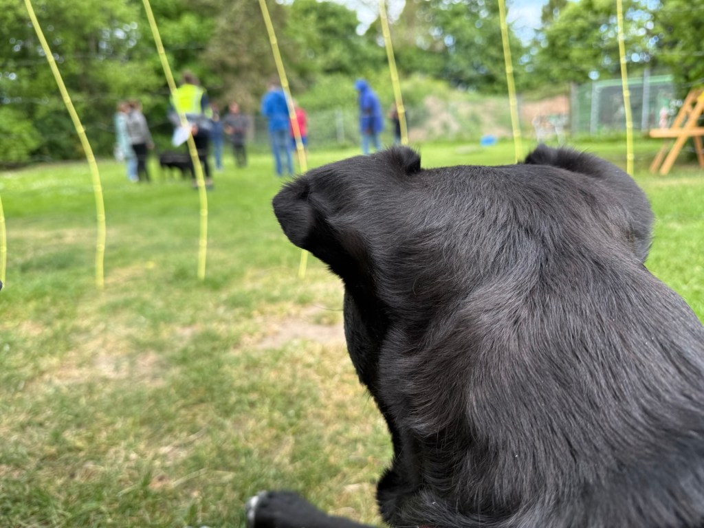 Es geht weiter zu den einzelnen Teststationen. Ein klappriger Herr mit Rollator- interessiert den Hund nicht. Ein dunkles Flattertuch, unter dem wir 2x durchgehen müssen- geschenkt. Da ist jemand gestürzt und zappelt nun auf dem Boden rum- whatever. Da hoppelt noch einer auf Krücken an uns vorbei- den hab ich doch eben schonmal gesehen, egal. Dann wird der Regenschirm aufgespannt- oh ein Maulwurfshaufen, wie toll. Danach raschelt jemand mit Besteck- ist schon Fressizeit? Oh schön, da auf dem Stuhl gibts endlich wieder Futter, aber warum zieht die jetzt die Hand weg? Spinnt die??? 😳 Ach ja, zum Glück macht sie die Hand dann doch auf und Hund kriegt das Futti. Nun kommt noch eine andere Frau von hinten und tatscht ihr am Hintern rum. Das findet sie nicht so knorke, läßt sich aber dann doch streicheln. Und dann kommt unser Endgegner… Ein alter Herr mit Stock, dunklen Klamotten und tiefer Stimme samt tief in die Stirn gezogener Kapuze… Den findet sie mal sehr gruselig und weicht zurück. Man kann richtig sehen wie Engel links und Teufel rechts auf ihrer Schulter sitzen und sie überlegt ob sie abhauen oder angreifen soll. Zum Glück macht sie nichts von beidem. Sie findet den Mann zwar nicht so toll, knurrt oder bellt ihn aber nicht an (das hatten wir in den letzten 4 Wochen zu meinem Leidwesen ja ganz anders…). Er spricht sie an und sie macht einen Schritt auf ihn zu. Entscheidet sich letztlich aber doch lieber für den Rückzug. Puuuuuuuh. Gott sei Dank. Parcours nach 20 min beendet. Die Zeit ist geradezu verflogen bei der Vielfalt der Aufgaben.