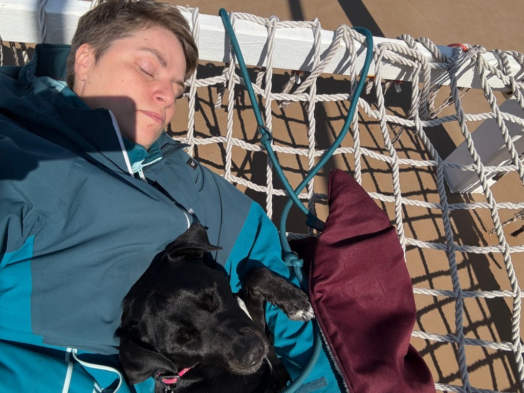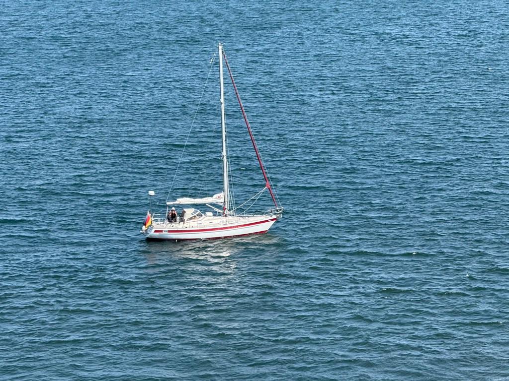Nach 10 Std sind wir nun fast in Travemünde angekommen. Nachdem es in Trelleborg so windig und kalt war, dass ich meinen Schlafsack rausholen musste auf dem Oberdeck, kam dann beim Zwischenstopp in Rostock der große Temperaturschock mit 26 Grad und Windstille. Leider hab ich wohl etwas zulange mit Yuna in der Sonne gesessen und sie hatte einen leichten Sonnenstich. Ich hatte doch schon etwas Panik bis ihr Atem wieder ruhiger ging und sie ein paar Schüsseln Wasser getrunken hatte 😮💨